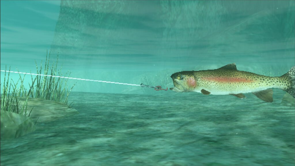 糸に負荷がかかると赤くなって、ギシギシと音がなるのでリールを巻いてはいけない。操作自体は分かりやすく、設定が細かくないので釣りに慣れていない人でもプレイしやすく作られている。糸が切れてもミミズが無くならないのもお手軽。