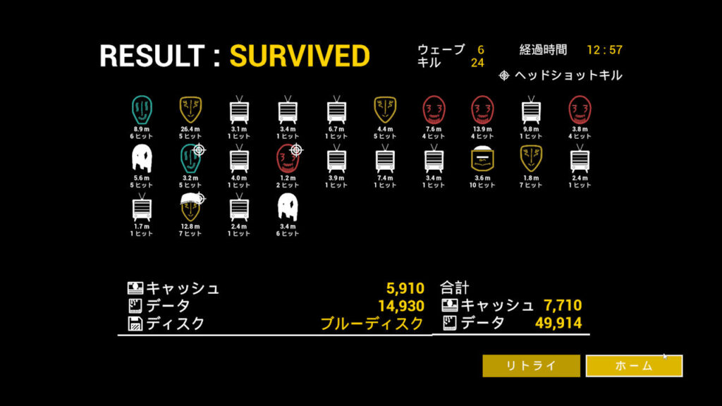 ステージにずっといるとウェーブが進んで武装した敵が登場して手ごわくなる。ある程度強化が済んだらどこまで耐えられるかを腕試しするのも面白いだろう。