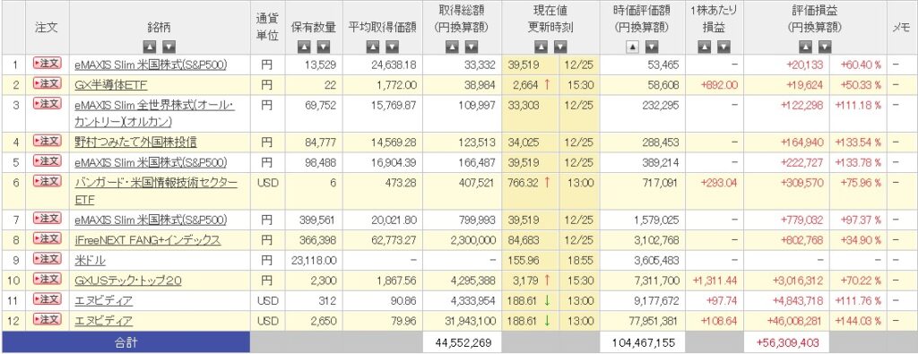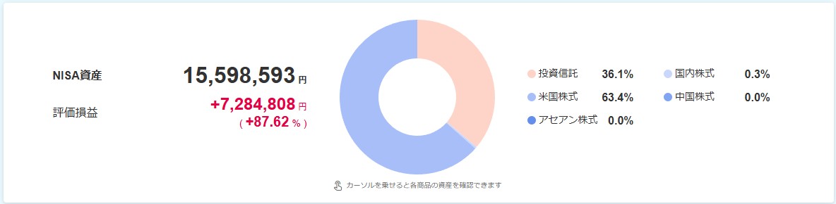NISAの合計は1500万。成長投資はNVDA一括、積み立てはFANG+で月10万積み立てている。