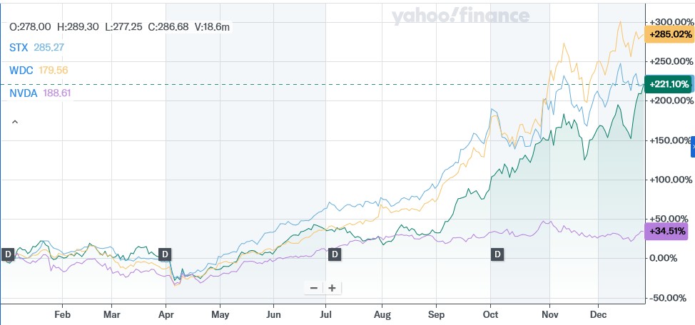 NVDAの上昇率は35%とやや物足りない。その代わり、STX(シーゲイト)、WDC(ウエスタンデジタル)、MU(マイクロン)は200%以上の上昇とデータセンターの周辺機器がアツかった。自作PCにも悪影響を与えており、メモリの値上げが凄まじい。